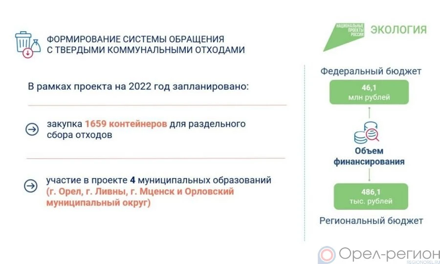 В Орле в 2022 году появятся 1104 контейнера, в Орловском МО - 251, в Ливнах - 173, в Мценске приобретут 131 контейнер.
