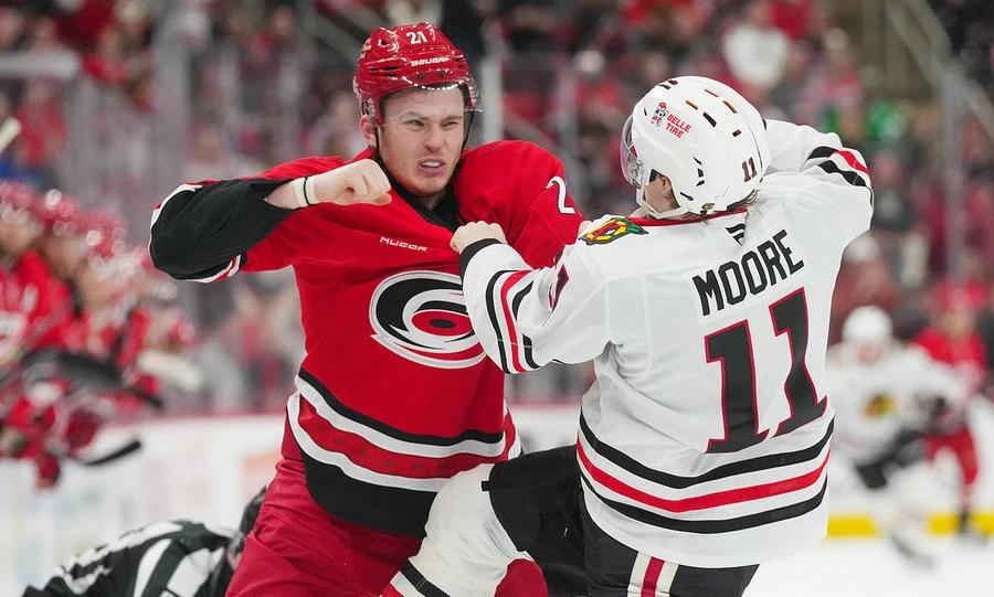 Победа в кулачном бою не помогла «Каролине» одержать верх в матче. Основное время завершилось со счётом 3:3, а в серии буллитов удача оказалась на стороне гостей. Отметим, что решающую шайбу забил Оливер Мур.
