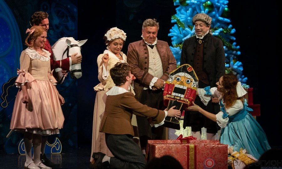 Крёстный Дроссельмейер (Сергей Козлов) приходит в гости со своим племянником (Валентин Тюрин) и дарит куклу Щелкунчика - в таком же красном мундире, как у героя из всеми любимого мультфильма, того самого, где звучит музыка Чайковского. Но на этом параллели заканчиваются. У спектакля свои мелодии - лирические и весёлые, мистические и торжественные.