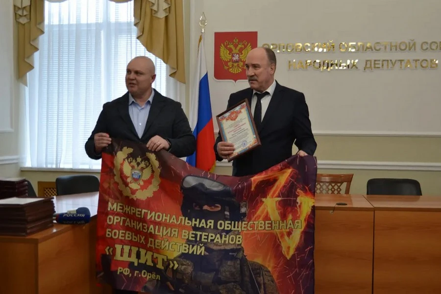 В торжественной церемонии, прошедшей 28 января в Орловском областном Совете народных депутатов, приняли участие спикер регионального парламента Леонид Музалевский, вице-спикер Михаил Вдовин, председатель Орловского городского Совета народных депутатов Владимир Негин и председатель межрегиональной общественной организации ветеранов боевых действий «ЩИТ» Сергей Бабичев.