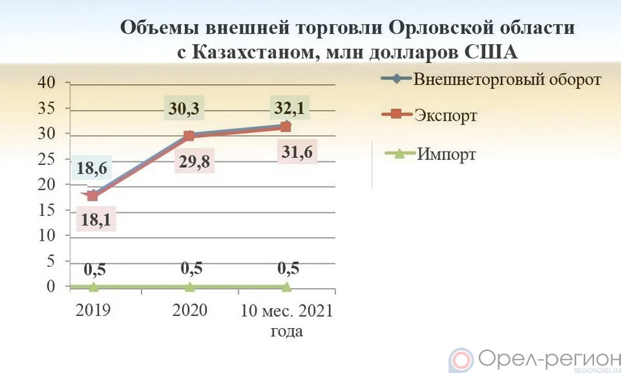 По данным ФТС России за 10 месяцев 2021 года объём внешнеторгового оборота Орловской области с Казахстаном составил 32,1 млн долларов США. Внешнеторговый оборот Орловской области за 10 месяцев 2021 года в разрезе стран-партнёров свидетельствует о том, что доля Казахстана составляет порядка 5% в общем объёме ВТО региона и 10% в общем объёме экспорта Орловской области и интенсивно растёт.