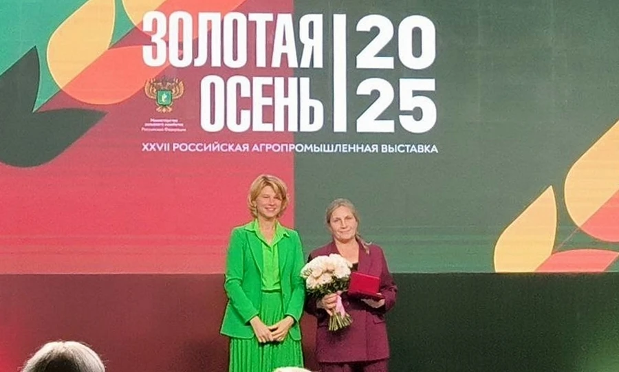 Министр сельского хозяйства РФ Оксана Лут вручила государственную награду оператору машинного доения колхоза «50 лет Октября» Людмиле Болгарцевой в рамках торжественных мероприятий XXVII Российской агропромышленной выставки «Золотая осень — 2025».