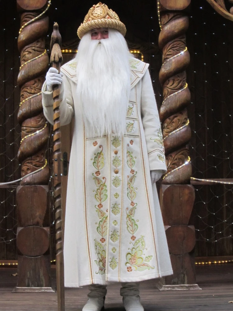 Дед Мороз вышел на крыльцо своего резного деревянного домика не в привычной красной шубе и валенках, а в длинном светлом кафтане, белых сапожках и соломенной шляпе. Оно и понятно — осень ещё на дворе.