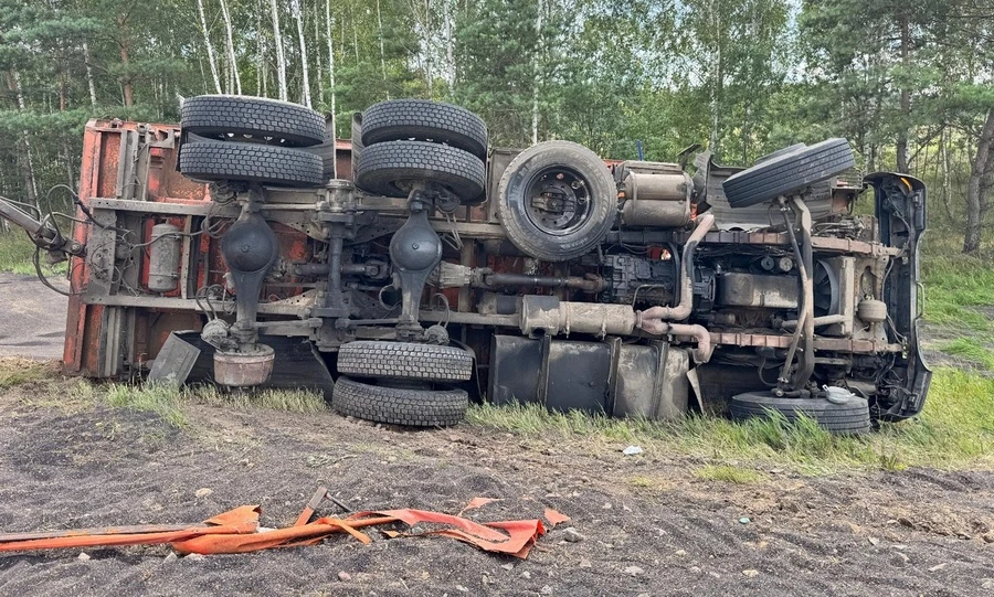 У грузовика взорвалось заднее колесо, машину занесло, КамАЗ перевернулся. В результате ДТП водитель получил телесные повреждения.