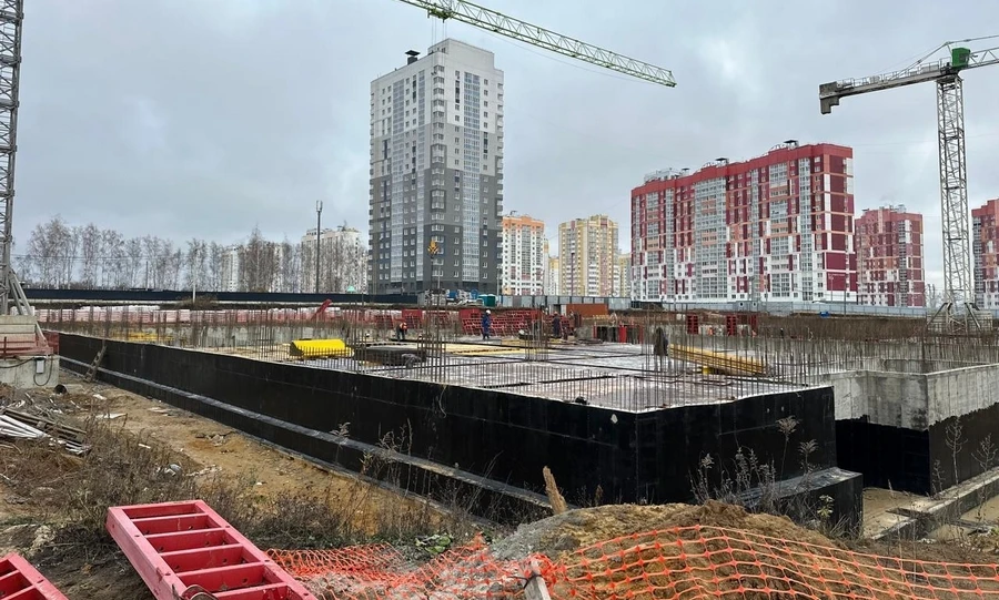 На текущий период на объекте завершены работы по бетонированию фундамента, строители приступили к монтажу каркаса и бетонированию несущих стен.