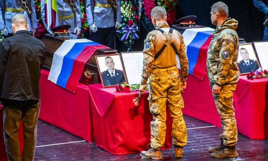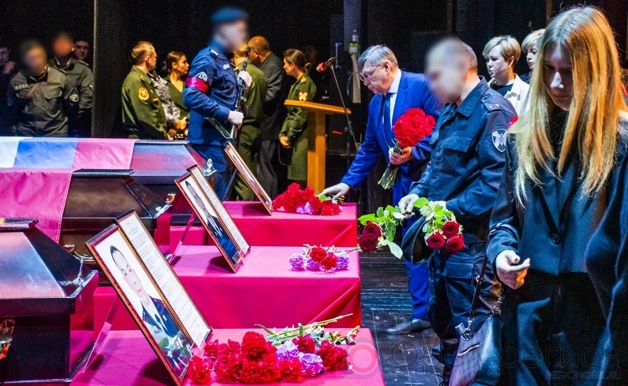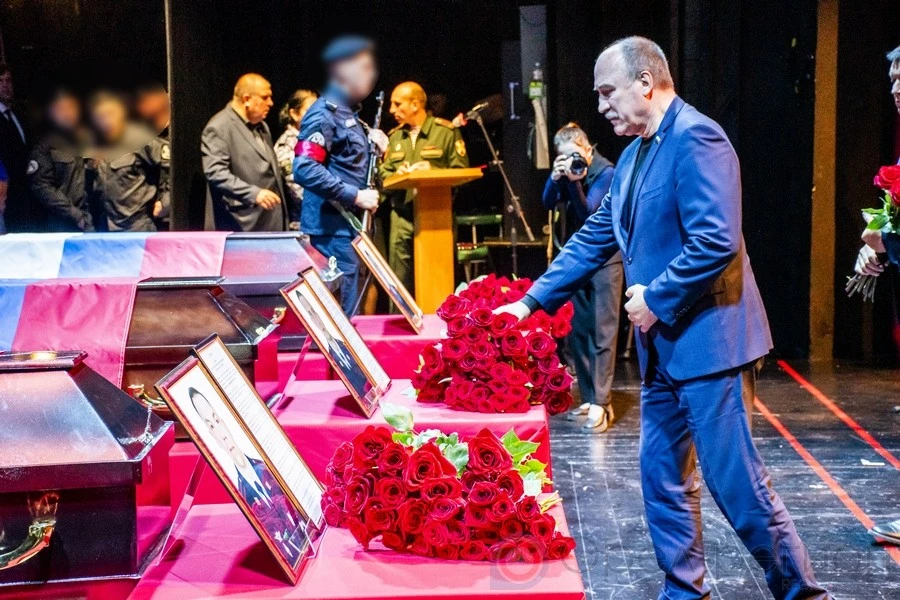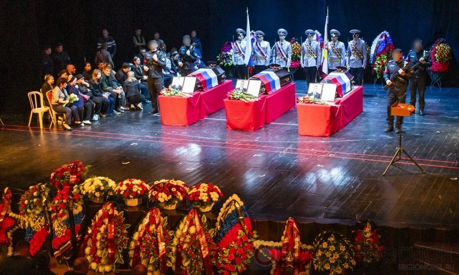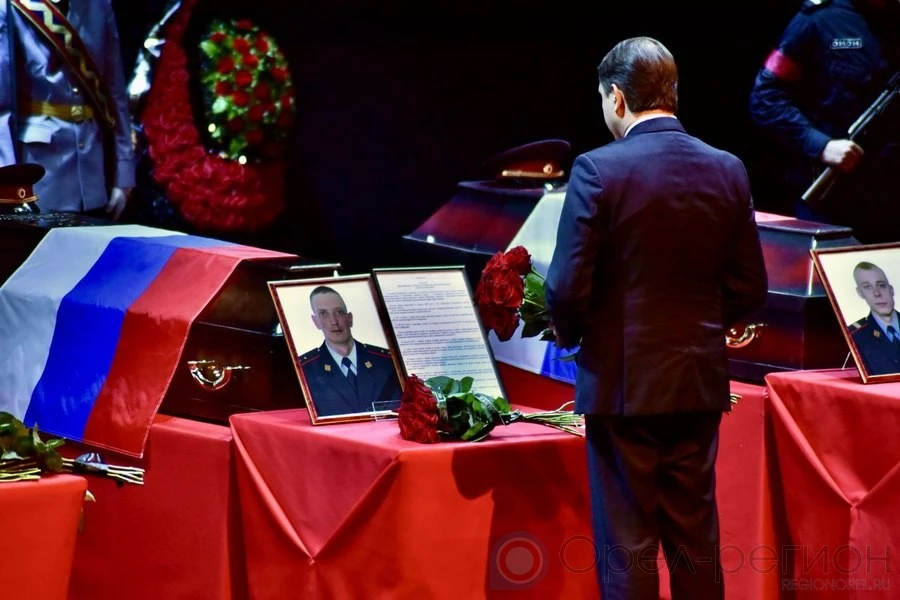 Траурная церемония прощания с сотрудниками ОМОН «Крепость» Управления Росгвардии по Орловской области, погибшими при исполнении служебного долга, прошла 17 сентября в Орловском государственном академическом театре имени И. С. Тургенева.