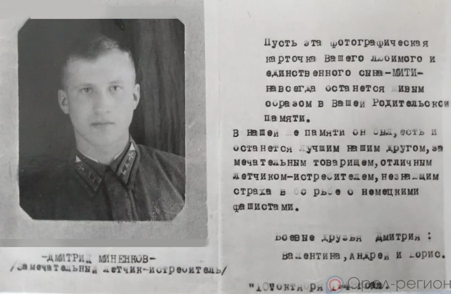 В октябре 1943 года боевые друзья Дмитрия Миненкова Валентина, Андрей и Борис прислали его снимок родителям с такой надписью: «Пусть эта фотографическая карточка вашего любимого и единственного сына Мити навсегда останется живым образом в вашей родительской памяти. В нашей памяти он был, есть и останется лучшим нашим другом, замечательным товарищем, отличным лётчиком-истребителем, не знающим страха в борьбе с немецкими фашистами».