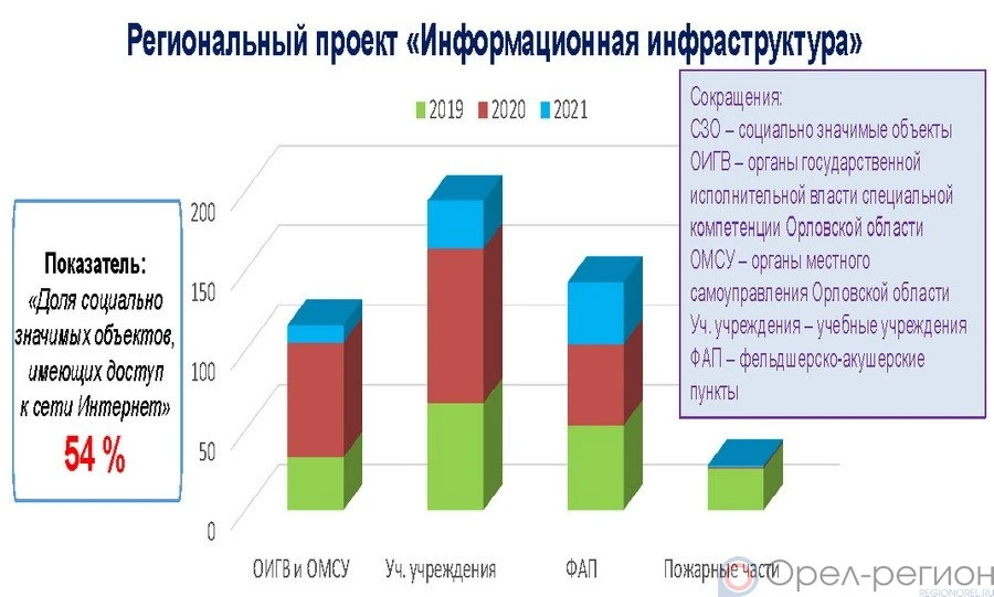 Подробнее об этом рассказал руководитель областного департамента информационных технологий Андрей Артёмов. Так, в рамках федерального проекта «Информационная инфраструктура» на Орловщине продолжается работа по подключению социально значимых объектов к сети передачи данных и(или) сети интернет. Подключение осуществляется АО «Объединённая ракетно-космическая корпорация». В 2019-2020 годах уже подключено 400 социально значимых объектов. За первые четыре месяца 2021 года - ещё 111. Значение показателя «Доля социально значимых объектов, имеющих широкополосный доступ к информационно-телекоммуникационной сети интернет в настоящий момент составляет 54%.