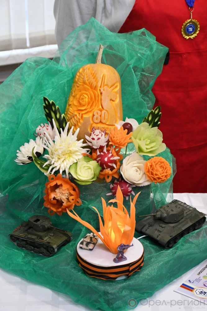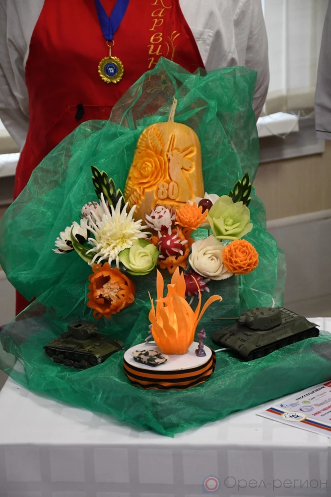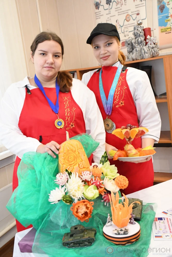 Выпускница Орловского техникума сферы услуг Наталья Трахинина завоевала серебряную медаль в номинации «Живой карвинг». В режиме реального времени девушка изготовила композицию, посвящённую 80-летию Великой Победы.