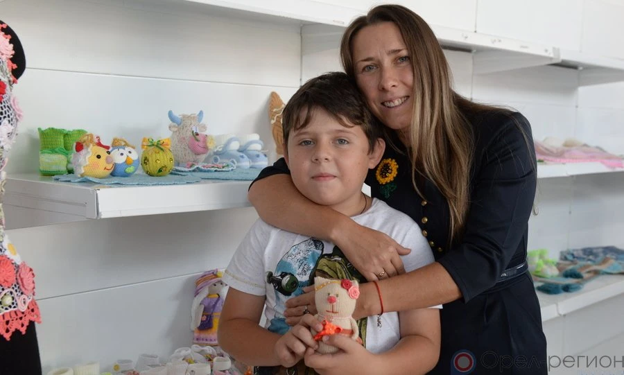 Невысокая миловидная женщина, несуетливая, приятная в общении, стоит у стеллажей со своими работами и трогательно обнимает сына Серёжу.