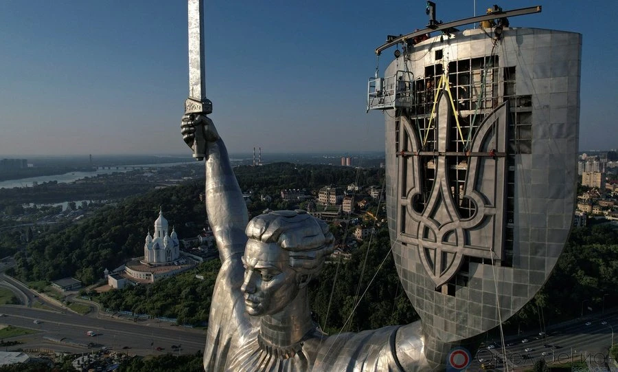 Установленная на правом берегу Днепра 62-метровая статуя Родины-матери - лакомая цель для украинских манкуртов. И они-таки «украсили» её своим тризубом - символом нынешнего националистического киевского режима.