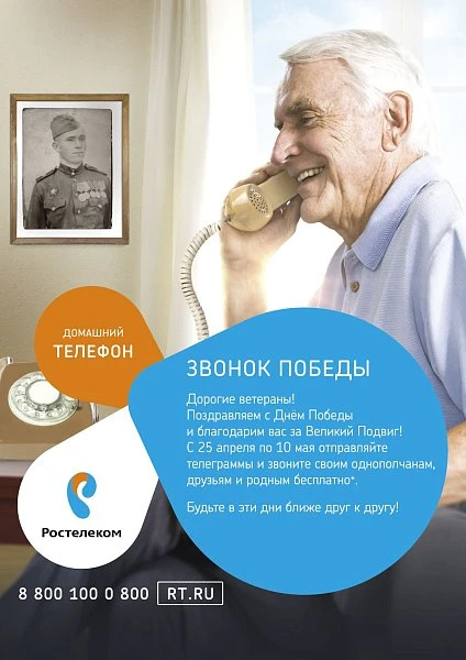«9 Мая 1945 года – особая веха героической летописи нашей страны. В этот день закончилась самая жестокая, самая кровопролитная война ХХ столетия. Память о той Великой Победе объединяет всех – ведь нет в России семьи, которую не опалила бы война. Отдавая дань памяти павшим героям, чествуя ныне здравствующих ветеранов Великой Отечественной войны, наша компания уже не первый год дарит возможность бесплатного общения», - отметил директор Орловского филиала ПАО «Ростелеком» Юрий Солдатенков.