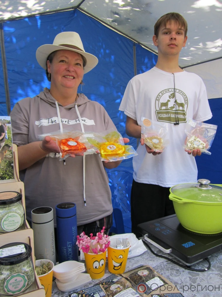 Гости фестиваля не проходили и мимо семейных подворий. На одном из них расположилась семья Шатуновых из Мценского района. Елена Владимировна и её 16-летний сын Артемий представили вкусную натуральную домашнюю продукцию — крафтовый чай ручной работы с изысканными сочетаниями трав, ягод и цветов и козий авторский сыр «Панир» с различными добавками — розмарином, орехами, паприкой, черносливом, мёдом...