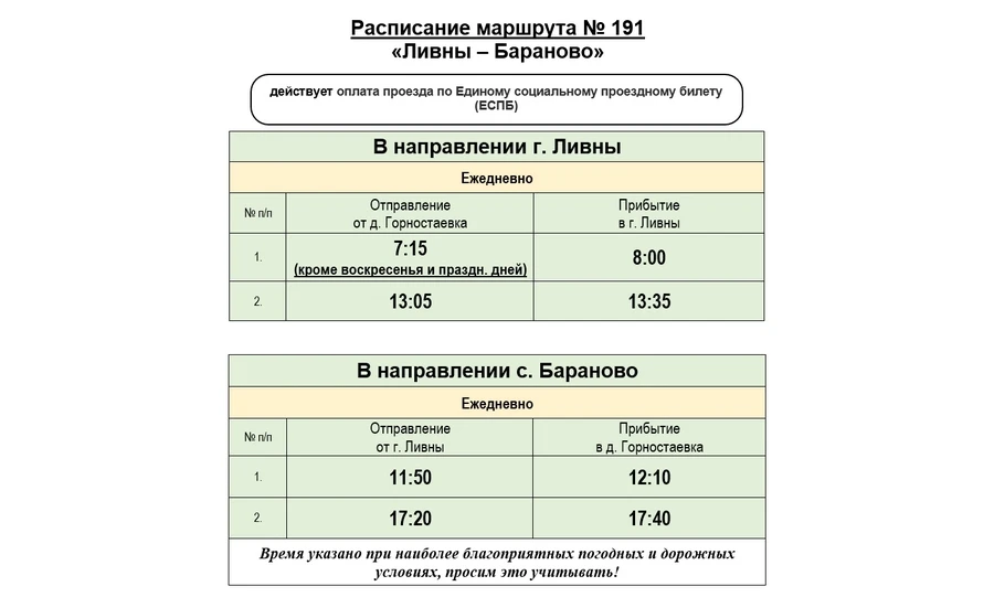 В Ливенском районе на время паводка в Горностаевку будет заезжать автобус В связи с обращением жителей деревни заезд ежедневно будет осуществлять автобус № 191 «Ливны — Бараново». Перевозчиком по данному маршруту является ООО «Автотранспортное предприятие».