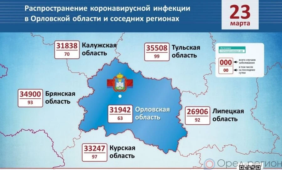 По информации федерального оперативного штаба, по состоянию на 23 марта в Орловской области зарегистрировано 31 942 случая заболевания коронавирусом.