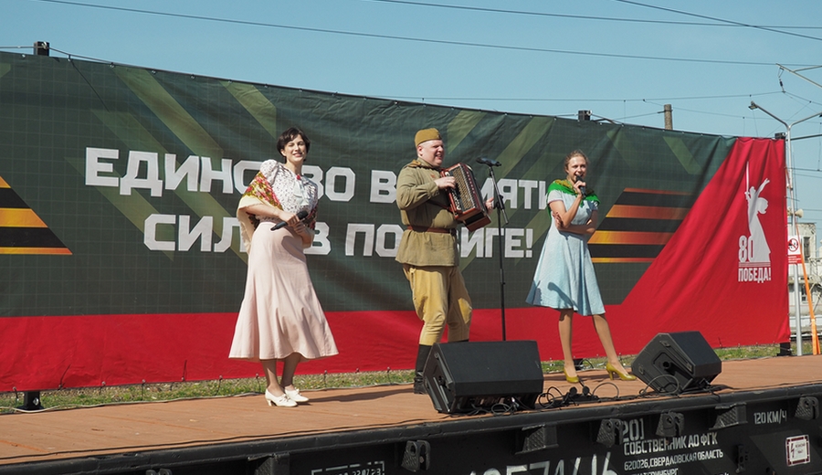 На платформе-сцене поезда для жителей и гостей города с культурной программой выступили сводная концертная бригада Академического ансамбля песни и пляски им. А.В. Александрова и Театра Российской армии, а также вокально-инструментальный ансамбль 106-й воздушно-десантной дивизии «Крылатая Гвардия».