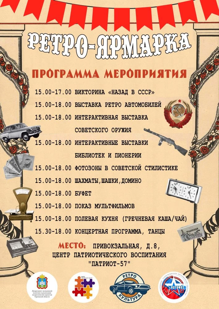 Гостей ярмарки ждёт выставка автомобилей, советского оружия, экспозиции библиотек и пионерии, фотозоны в советской стилистике, настольные игры, показ советских мультфильмов, концертная программа с произведениями советского времени.