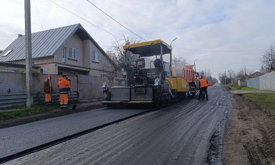 Дорожным рабочим предстоит обновить полотно протяжённостью 150 метров. В этом им помогают помогают современные машины: асфальтоукладчик, каток, компрессор, два трактора МТЗ и три самосвала с тралом.