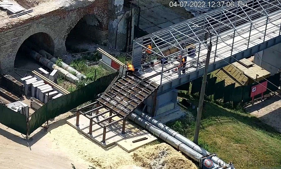 Подрядчик приступает к монтажу временного коммуникационного моста, который соединит Железнодорожный и Заводской районы со стороны моста Дружбы. Опоры на него, по аналогии с возведением временной пешеходной переправы, будут подаваться 50-тонным гусеничным краном над существующей пешеходной галереей. Чтобы не подвергать пешеходов опасности, было принято решение о временном закрытии пешеходного движения.