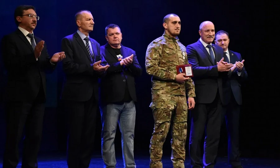 Леонид Музалевский вручил памятную медаль областного Совета «За самоотверженность и патриотизм» уроженцу Орловщины, участнику легендарной операции «Поток» Евгению Варламову.