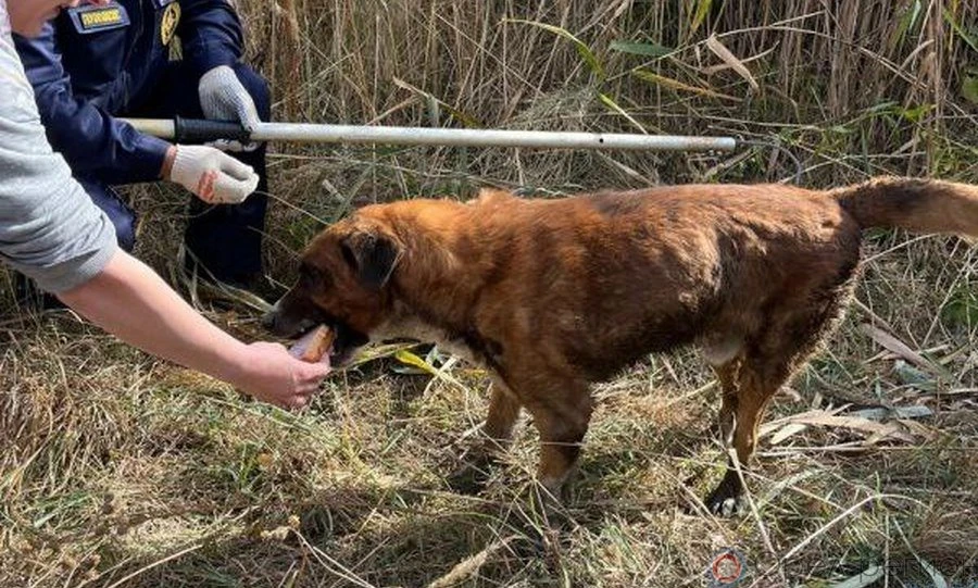 Приехавшие на вызов спасатели оказали необходимую помощь, они подняли собаку, а также напоили и накормили животное.