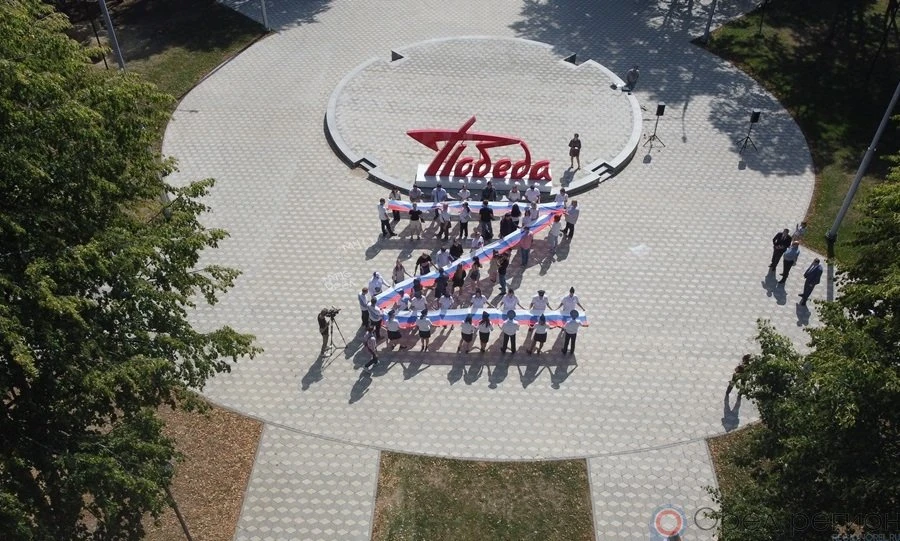 Около 50 человек выстроились в букву Z, держа в руках российский флаг, после чего триколор был поднят под звуки гимна РФ.
