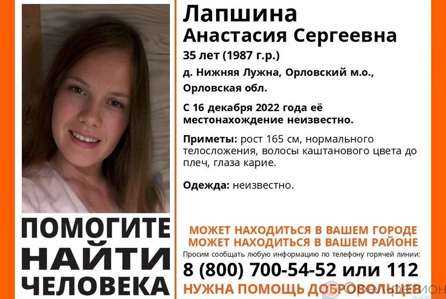 Пропавшей девушке 35 лет, проживает в д. Нижняя Лужна Орловского МО. Приметы: каштановые волосы до плеч, карие глаза, рост 165 см, среднее телосложение.