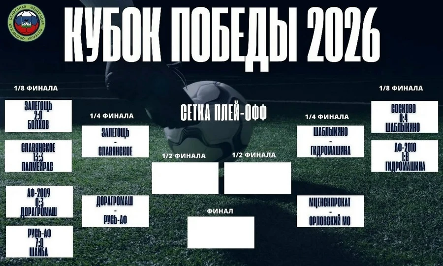 В четвертьфинале лицом к лицу сойдутся «Залегощь» и «Славянское», «ДорАгроМаш» и «Русь-АФ», «Шаблыкино» и «Гидромашина», «МценскПрокат» и «Орловский МО». (0+)
