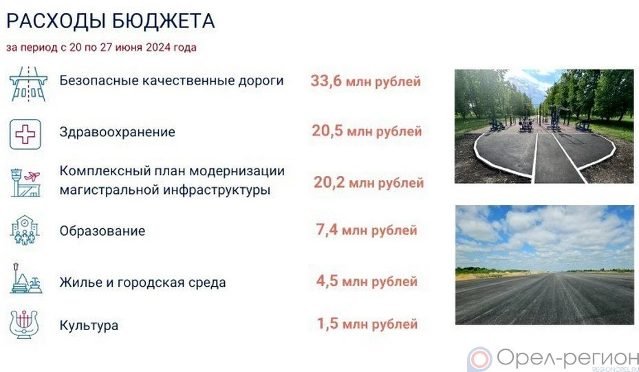 С 20 по 27 июня деньги были направлены на реализацию национальных проектов «Безопасные качественные дороги» (33,6 млн. руб.), «Здравоохранение» (20,5 млн), «Комплексный план модернизации и расширения магистральной инфраструктуры» (20,2 млн), «Образование» (7,4 млн), «Жильё и городская среда» (4,5 млн рублей), «Культура» (1,5 млн).