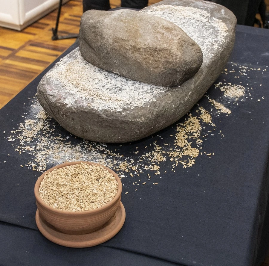 Есть на выставке и интерактивный экспонат — зернотёрка. На большом гладком камне лежит камень поменьше. Желающие понять, каково это — добыть щепоточку муки, могли зернотёркой воспользоваться. Но чтобы подвинуть камень, надо приложить немалое усилие — в поте лица доставался нашим предкам хлебушек!..