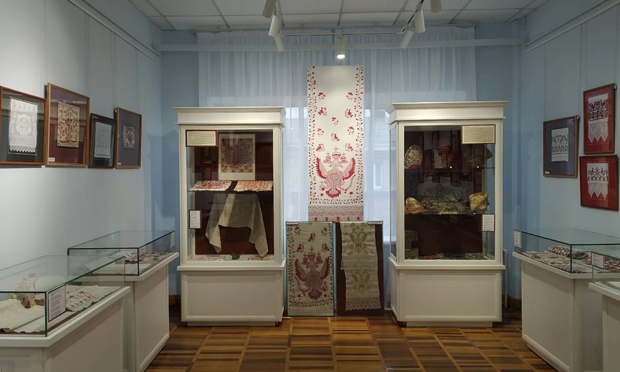 Очень часто вышивка украшала женские головные уборы. На выставке можно увидеть кичку, кокошник и сороку, расшитые золотым шитьём, бисером и блёстками. Порой даже части головного убора носили птичьи названия. Например, в сороке были крылья (боковая часть) и хвост (задняя часть); название «кокошник» идёт от слова «курица», а «кичка», или «кика», — это «утка, качающаяся на воде». Кстати, кичка по вере наших предков обладала большой оберегающей силой. Чаще всего надевался этот довольно массивный головной убор по праздникам. И чтобы удерживать его, женщине приходилось высоко поднимать голову. Так и появилось слово «кичиться».