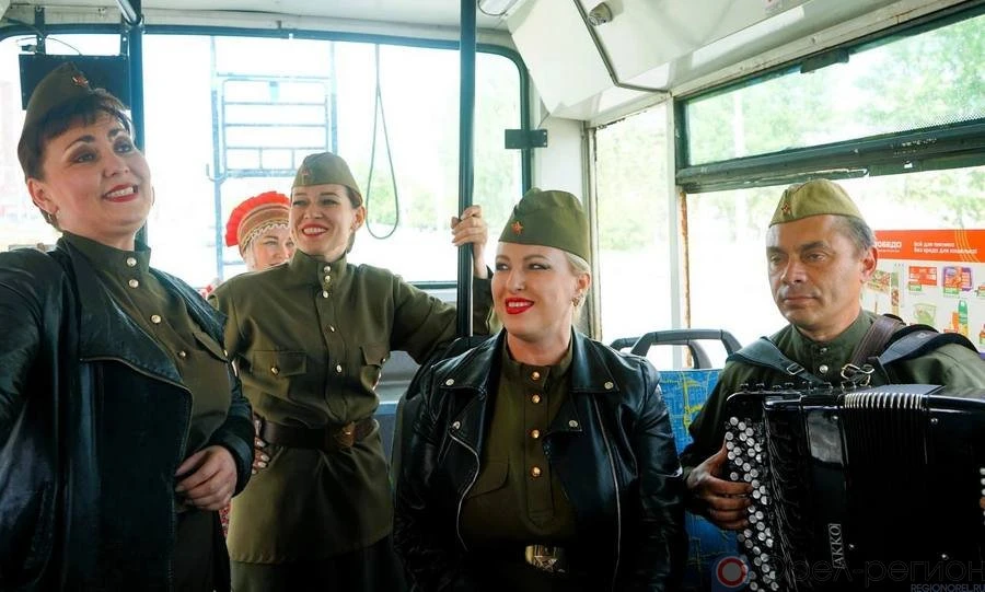 Сегодня площадкой для выступления ансамбля «Славица» стал троллейбус №6. Артисты исполнили русские народные песни и хиты военных лет.