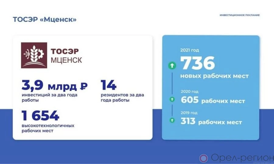 Он также подчеркнул, что развитие преференциальных территорий: особой экономической зоны «Орёл» и территории опережающего социального экономического развития «Мценск» остаётся приоритетной темой.
