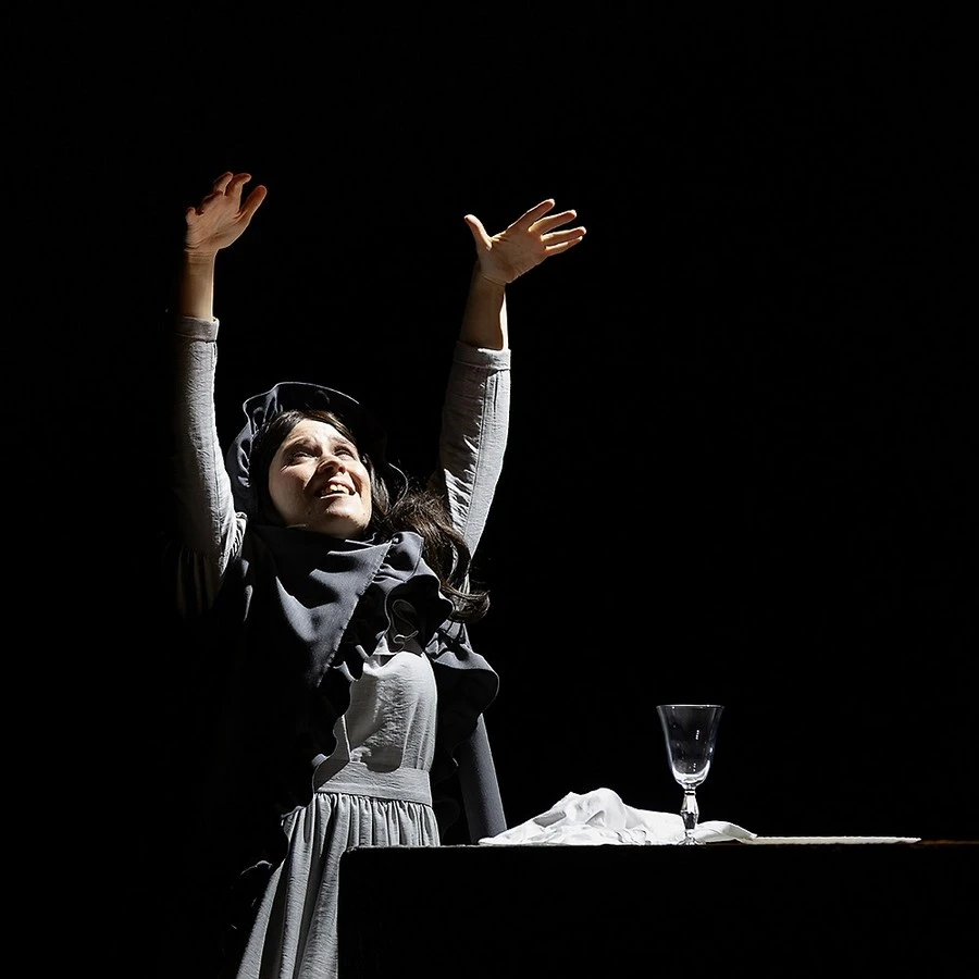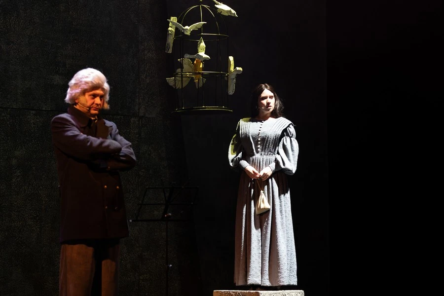 Замысел раскрывается не сразу, хотя изящные подсказки даёт нам художник-постановщик Ольга Далент: игра света, клетки с птицами как образ несвободы героини. Управляет настроением точно подобранная музыка. Остался лишь один вопрос: зачем героям парики? Мелочь вроде, но очень уж они нелепы и в драматичные моменты выглядели комично.