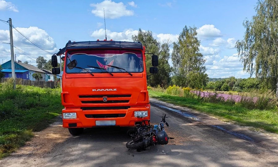 Мужчина на мопеде выехал на встречную полосу и врезался в КамАЗ. В результате ДТП водитель двухколёсного транспорта получил телесные повреждения.