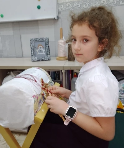 — Аня пришла в нашу школу кружевниц в пять лет, мы три года занимались с ней и ещё с двумя её ровесницами в нулевом классе, — говорит Анна Алексеевна. — В былые времена в Мценске пятилетним детям давали поиграть в коклюшки, а в семь лет они уже садились плести приданое. Вот мы решили провести эксперимент — показать пятилетним детишкам, как плетётся кружево. Через пару лет Анечка уже делала неплохие конкурсные работы — маленькие, конечно, как и положено маленьким детям, но уже заметные. Сейчас Аня учится в 1-м классе, ей восемь. Она очень ответственный и трудолюбивый ребёнок.