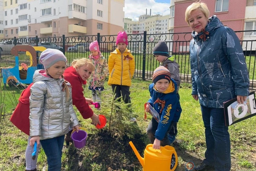 Библиотекари Е.А. Позднякова и Е.Т. Салахутдинова пригласили юных читателей принять участие в акции и посадить на территории садика пять маленьких ёлочек. На каждое деревце дети собственноручно закрепили ламинированные таблички с именами погибших на фронтах солдат - своих родственников, которые подарили нам светлое будущее ценой своей жизни.