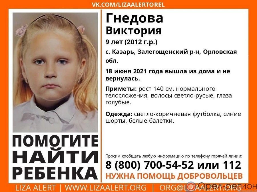 - За информацию, способствующую установлению местонахождения Гнедовой Виктории объявлено вознаграждение 500000 рублей. Анонимность гарантируется. Информацию просим сообщать по телефону 02 (с мобильного 102) или 8-(4862)-43-32-32(Дежурная часть УМВД), - рассказали в пресс-службе УМВД России по Орловской области.