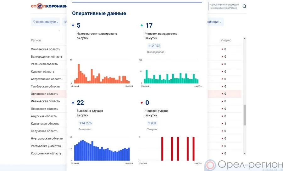 В России за сутки уменьшилось число подтверждённых новых случаев заболевания COVID-19. Так, 17 июля было 4664 человека, 18 июля зарегистрировано 4548 (- 116 за сутки).