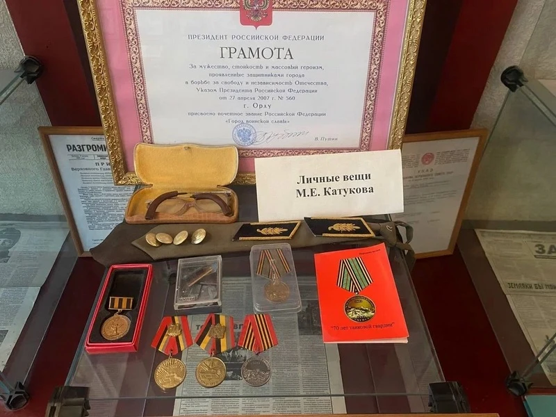 В экспозиции открытого в 2003 году музея много материалов, связанных с Великой Отечественной войной и жизнью легендарного военачальника. Михаилу Катукову принадлежит первый крупный успех советских танковых войск. В боях у села Первый Воин Мценского района с 4 по 11 октября 1941 года его бригада смогла сдержать наступление рвавшихся к Москве 3-й и 4-й танковых дивизий вермахта, входивших во 2-ю танковую армию генерала Гудериана. За этот подвиг 4-я танковая бригада первой в Красной Армии получила почётное звание «Гвардейская» и стала именоваться 1-й гвардейской.